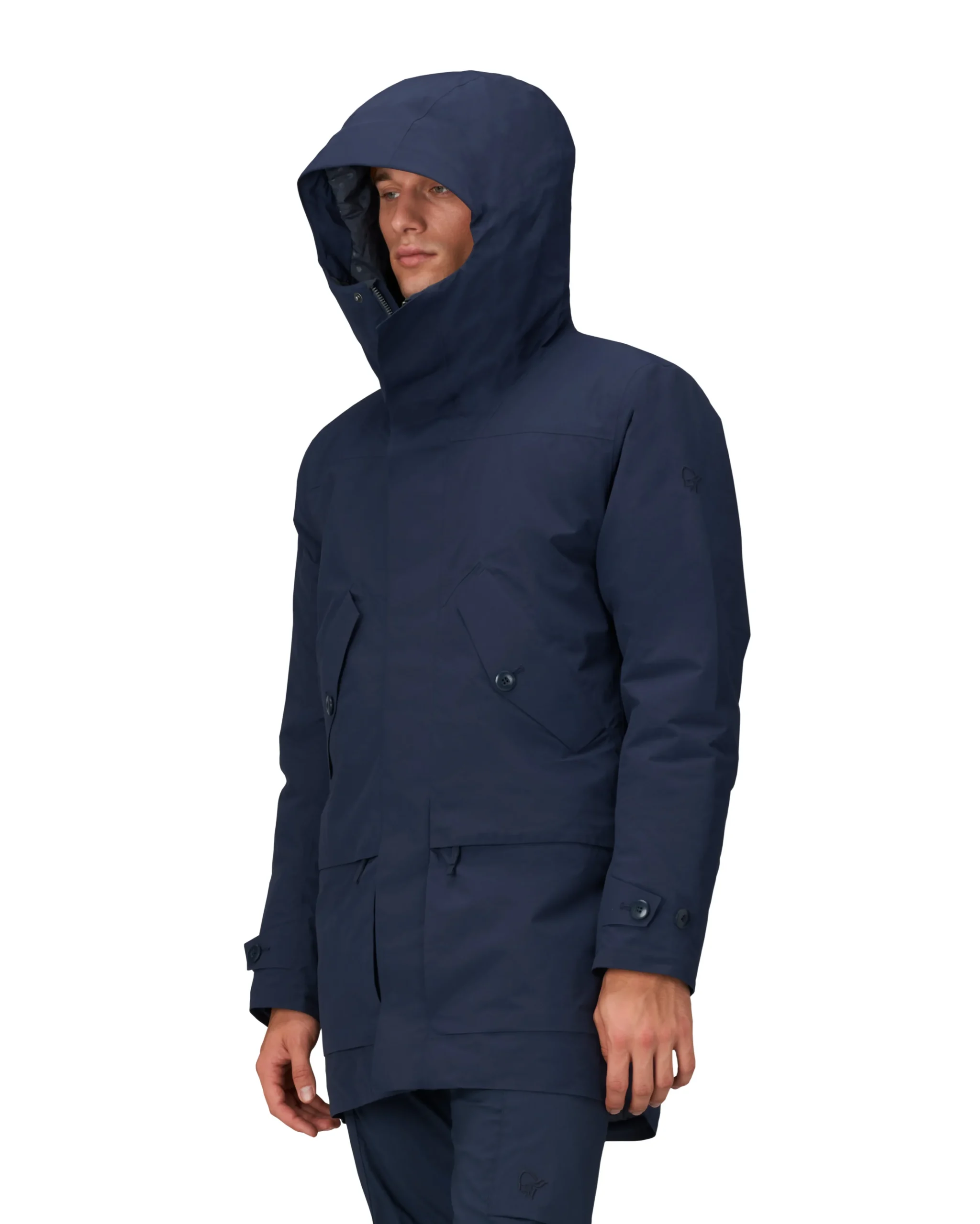 Jakken har et vanntett og resirkulert ytterlag av GORE-TEX® og isolasjon av resirkulert PrimaLoft®. Snittet er langt slik at du ikke fryser på baken, og jakken har en beskyttende hette som kan justeres med én hånd.
